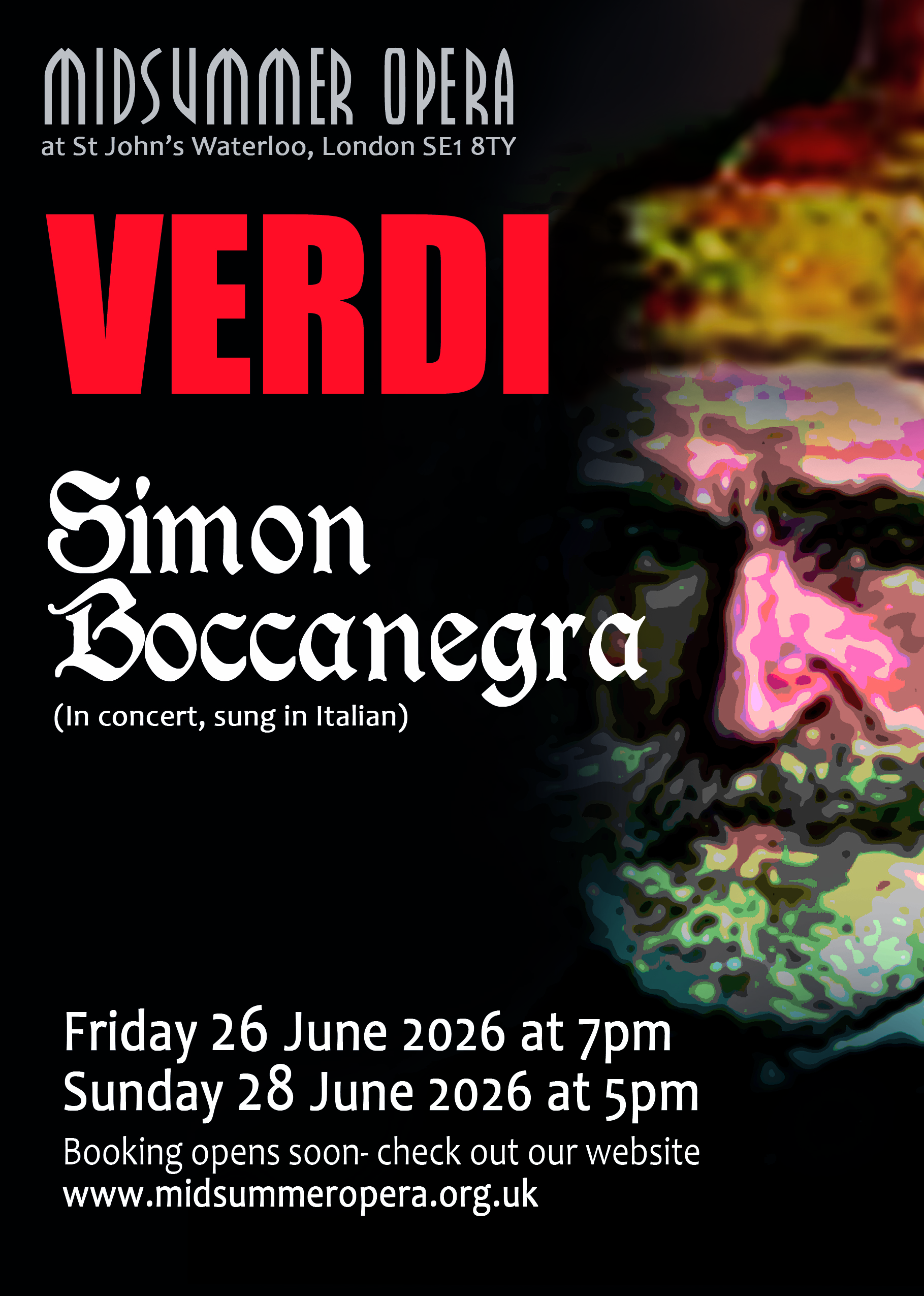 Soloists: Simon Boccanegra, Andrew Mayor; Maria Boccanegra, Zoe South; Jacopo Fiesco, Gerard Delrez; Gabriele Adorno, John Upperton; Paolo Albiani, Ian Wilson-Pope; Pietro, tba.